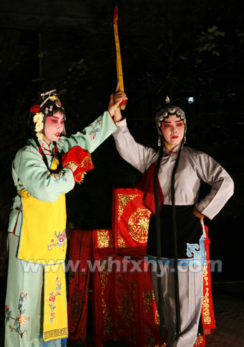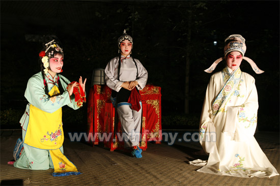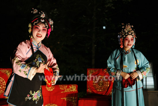 据此次巡演第一站的金色华府物业管理处的副主任刘定祥介绍,刚过下午6点,楚剧团的人就来了,开始挂横幅、搭建舞台和摆设备,演员们也开始化妆。不到7点,一曲经典楚剧《何氏劝姑》正式拉开此次汇演的序幕。